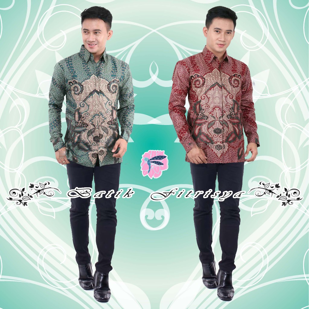 Best Seller Pakaian di Kota Singkawang Kemeja Bahan Premium Motif Perisai Hijau Merah Batik Pekalongan Jawa Pria Murah dari Batik Keluarga Fitrisya Kab. Batang